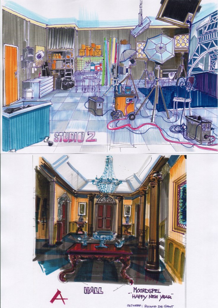 1986 Moordspel 380 Published 24 september 2015 at 737 × 1040 in Roland de Groot Moordspel (TROS, 1986), regie Guus Verstraete jr., Andrew Wilson, decor Roland de Groot. Collectie Roland de Groot