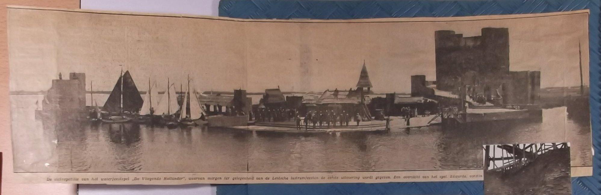 DSCF2589a Published 18 juli 2015 at 1997 × 648 in archief Weynand Grijzen: plakboek 1928-1958 Panoramafoto van het inmense decor: met een dorp (Stavoren) wat aan het einde van de voorstelling in het water zakte en ook weer omhoog gehesen kon worden voor de volgende voorstelling.