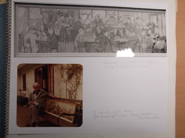 DSCF2593 Published 18 juli 2015 at 2304 × 1728 in archief Weynand Grijzen: plakboek 1928-1958 Illustratie van vele roemruchte figuren in Scheltema. Op de fot onder zit Weynand voor het bankje in zijn huis in Heino. Waar het schilderij is gebleven is mij niet bekend.