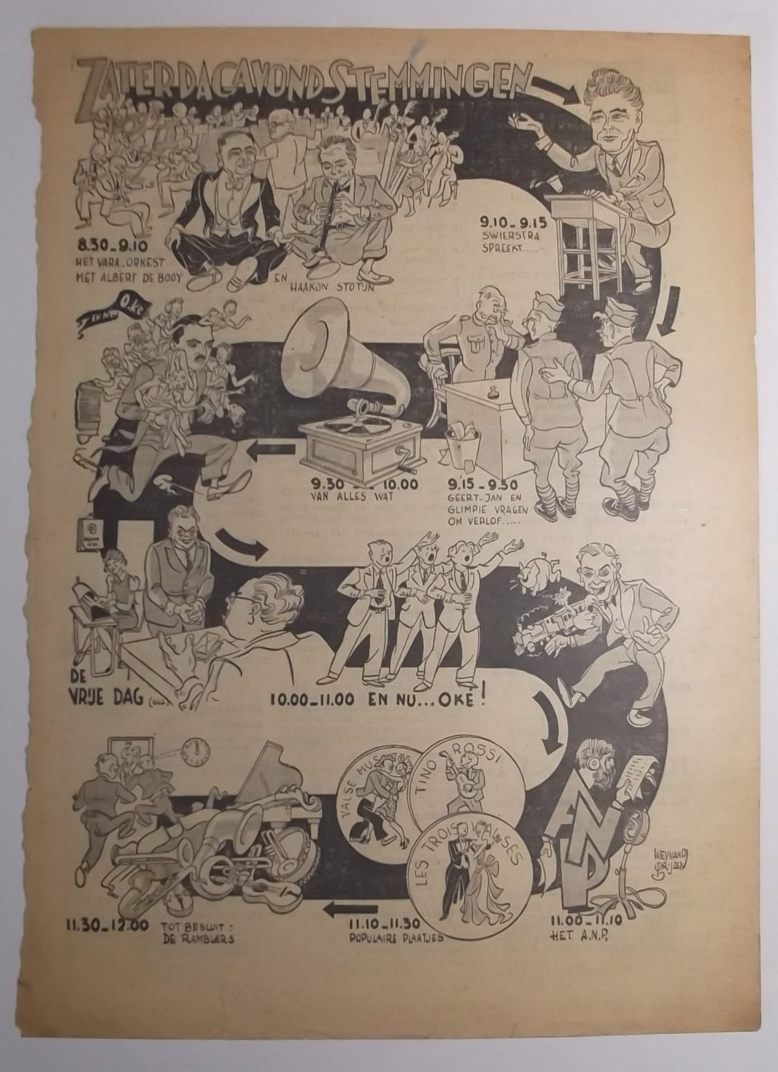 DSCF2635 Published 18 juli 2015 at 1127 × 1552 in archief Weynand Grijzen: plakboek 1928-1958 Voor de VARA radiogids tekende Grijzen prachtige programma-overzichten van het zaterdagavond programma. Periode 1939-1940