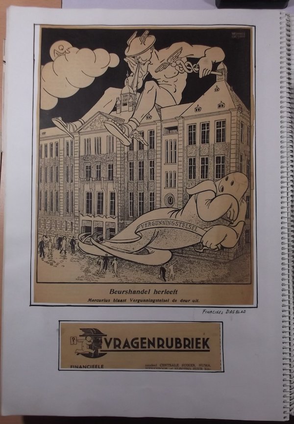DSCF2654 Published 18 juli 2015 at 1498 × 2156 in archief Weynand Grijzen: plakboek 1928-1958 Beurshandel herleeft, Mercurius blaast het vergunningsstelsel de deur uit. Nieuwsprent voor het Financieel Dagblad.