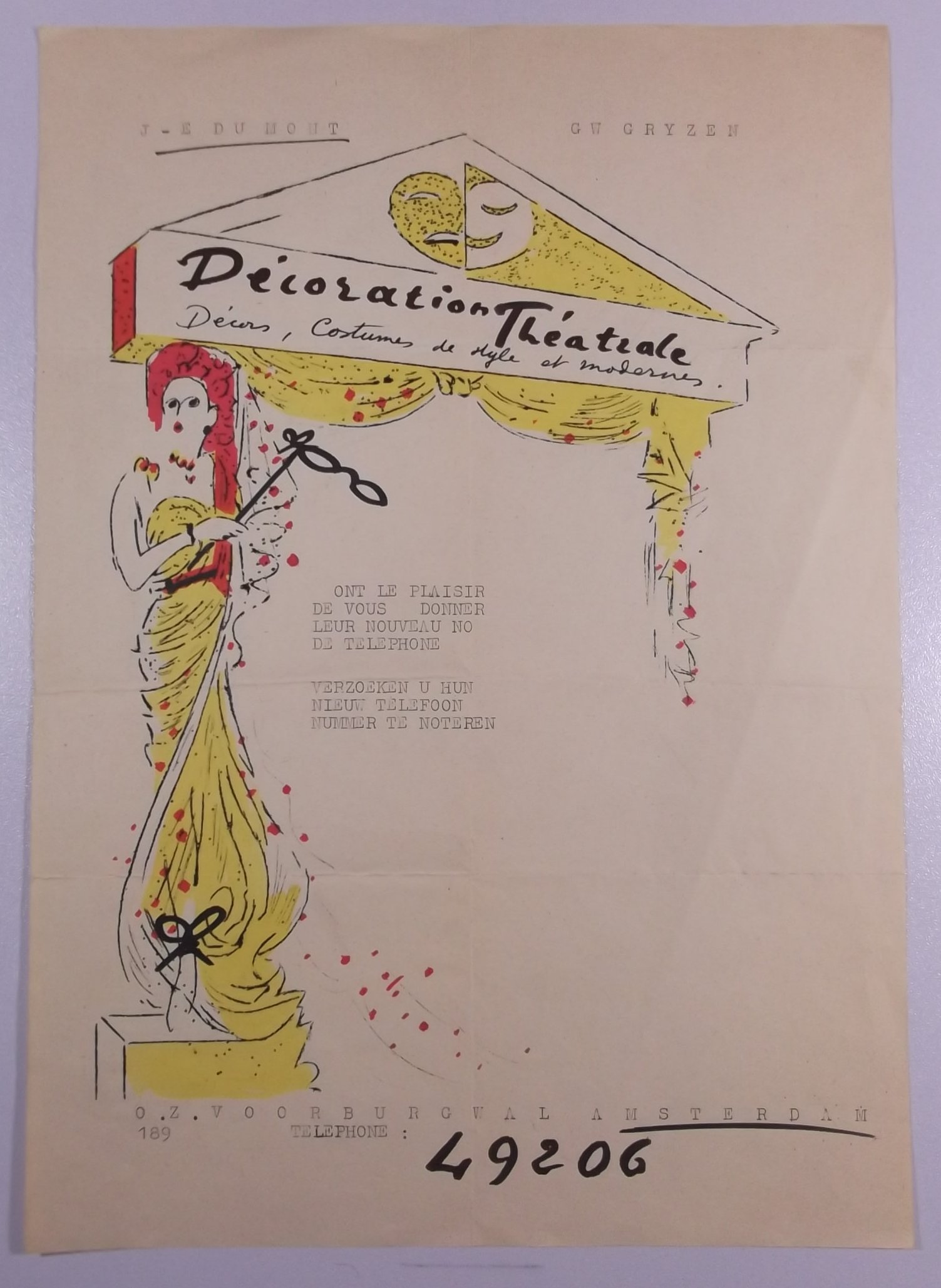 DSCF2695 Published 18 juli 2015 at 1503 × 2058 in archief Weynand Grijzen: plakboek 1928-1958 Grijzen raakt voor de oorlog bevriend met het echtpaar Dumont en trekt bij ze in. Samen met Jaques Dumont, die ontwerpt voor warenuis Metz & Co starten ze een ontwerpstudio voor “Decoration Theatrale. Decors, Costumes de style modernes.”